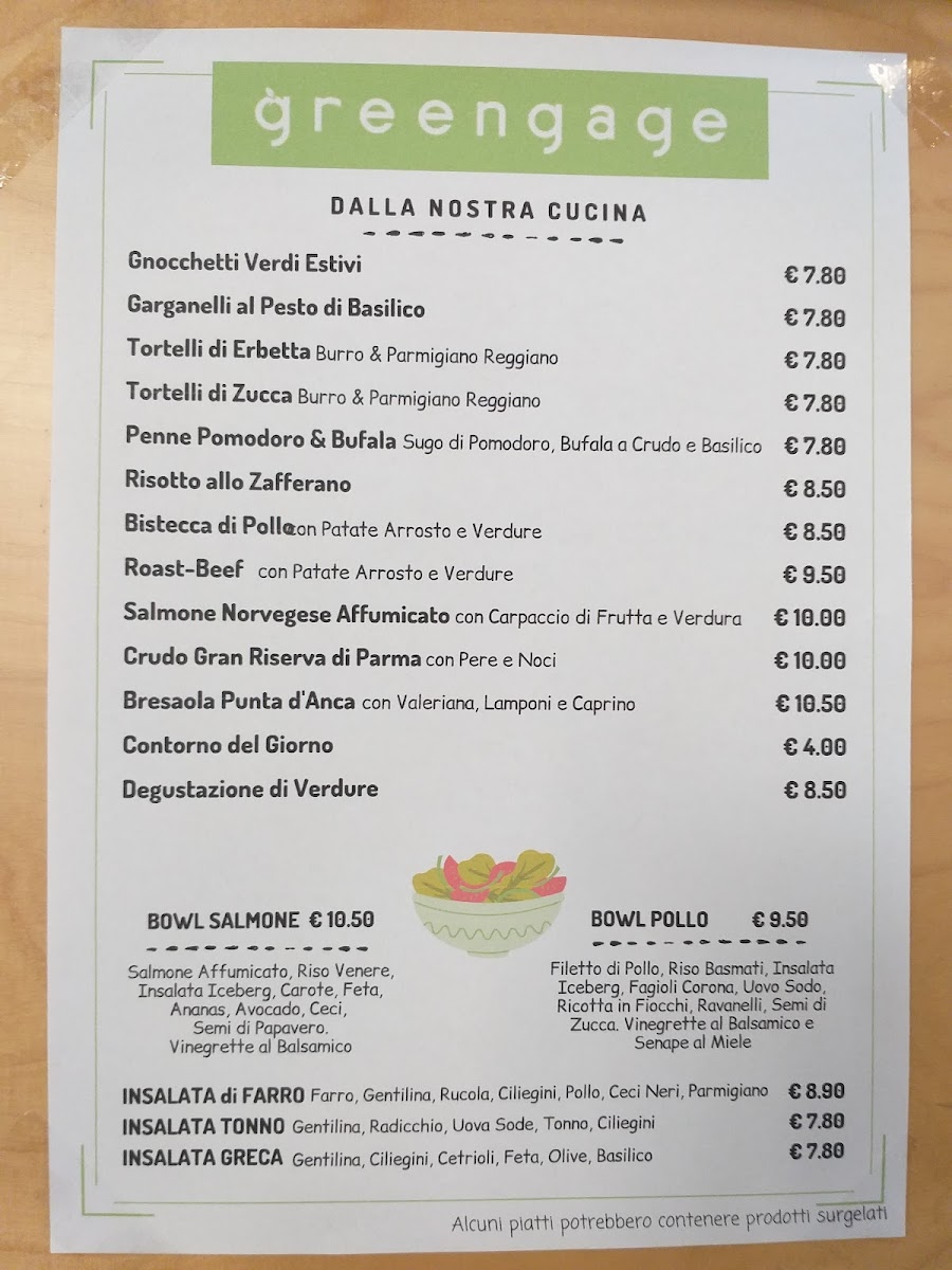 - Light Meals: Includes dishes like spaghetti al pesto, erbazzone with coffee, and various salads including options with eggs and tuna or mixed greens.